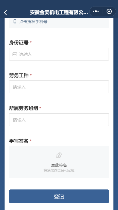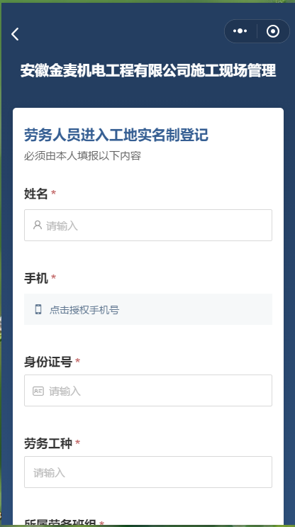 我公司为方便现场对劳务用工人员的实名制管理,落实国家对劳务实名制用工制度的规范要求,防止劳务纠纷,杜绝虚假用工信息,加强对分包或劳务班组的管理,为实名制劳务考勤制度的建立提供真实信息资料,从2020年9月1日起实行所有工地劳务人员用工进场进行扫描二维码,手机操作本人签名,公司微信小程序后台自动保存相关信息备查,扫描二维码实名制登记必须由本人操作,项目部审查相关信息真实后才能通过,否则一律不准进入工地现场。